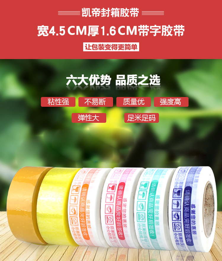 印字封箱膠帶,可以起到警示作用,也可以宣傳企業(yè)品牌。顏色分為紅、綠、藍(lán)三種。