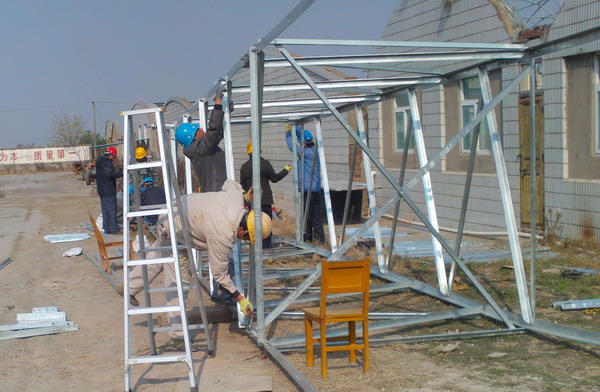 圖為職工在組裝鐵塔